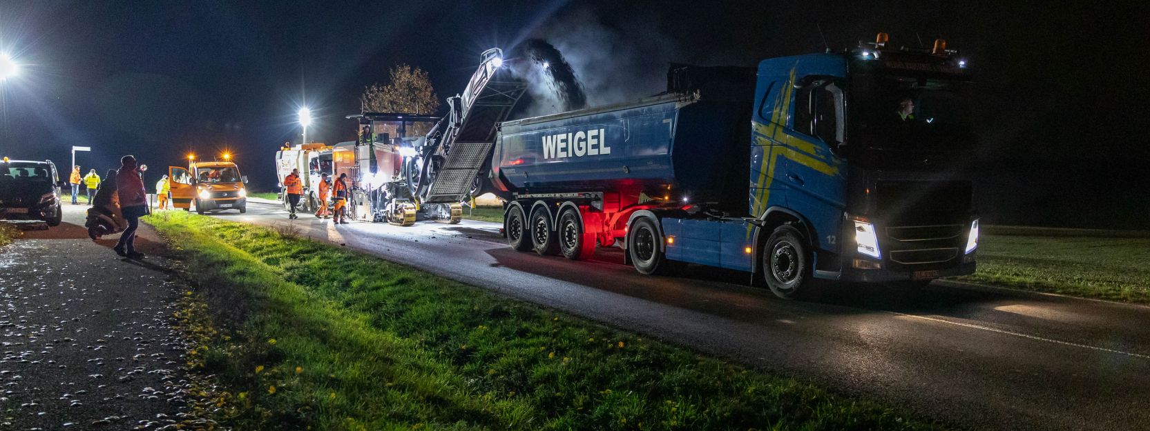 根据计划的设计,铣床在夜间四次沿着6米宽、1公里长的路段进行铣削。总共有16辆卡车在现场将沥青碾磨机运送到混合工厂,在那里它们被加工成粘合剂。该团队需要在道路重新开放之前完成所有的碾磨工作,这实际上是提前一个小时完成的,这得益于高效的流程。