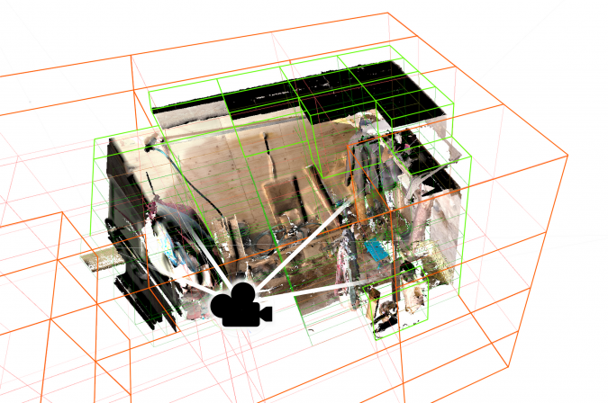 点云的虚拟现实可视化需要高效的空间索引系统,细节级别处理和拒绝不可见点的渲染(剔除)。这些系统允许引擎确定虚拟摄像机实际看到的点云的哪些部分,并且只渲染这些部分的足够细节。此外,渲染必须操作,以便从云的更遥远的部分绘制更少的点,只需最少的处理。要渲染的点的总数可以通过结合空间索引和剔除和多级细节(由距离决定)以及调整栅格化点的大小来保持在限制范围内。